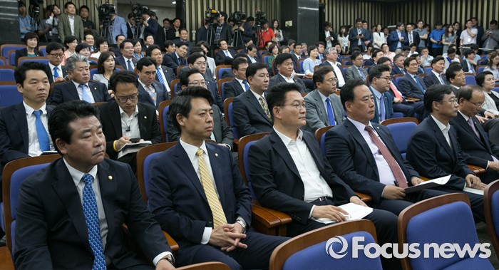 (서울=포커스뉴스) 7일 오전 서울 여의도 국회에서 열린 더불어민주당 의원총회에 참석한 의원들이 김종인 비대위 대표의 발언을 듣고 있다.