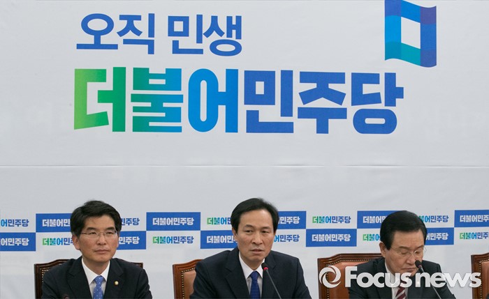 (서울=포커스뉴스) 7일 오전 서울 여의도 국회에서 열린 더불어민주당 원내대책회의에 참석한 우상호(가운데) 원내대표가 모두발언을 하고 있다.
