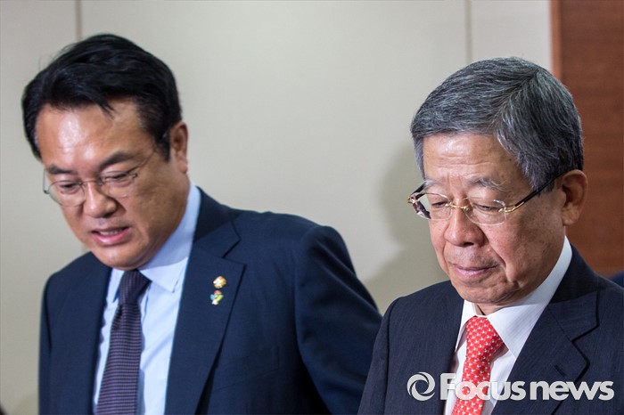 (서울=포커스뉴스) 김희옥(오른쪽) 새누리당 혁신비상대책위원장과 정진석 새누리당 원내대표가 7일 오전 서울 여의도 새누리당사에서 열린 '혁신비상대책위원회의'에 참석하기 위해 회의실로 들어서고 있다.