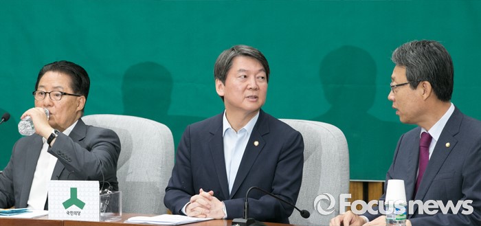 (서울=포커스뉴스) 7일 오전 서울 여의도 국회에서 열린 국민의당 의원총회에 참석한 안철수(가운데) 상임공동대표와 김성식(오른쪽) 정책위의장이 대화하고 있다. 왼쪽은 박지원 원내대표.