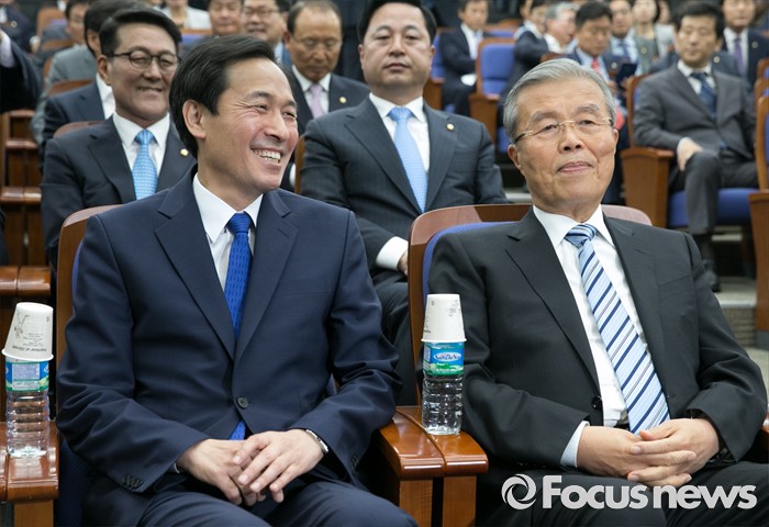 (서울=포커스뉴스) 7일 오전 서울 여의도 국회에서 열린 더불어민주당 의원총회에 참석한 김종인(오른쪽) 비대위 대표와 우상호 원내대표가 자리하고 있다.