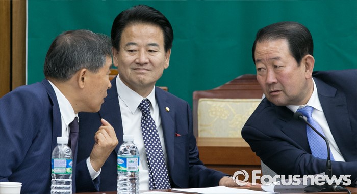 (서울=포커스뉴스) 7일 오전 서울 여의도 국회에서 열린 국민의당 의원총회에 참석한 황주홍(왼쪽부터), 정동영, 박주선 의원이 대화하고 있다.