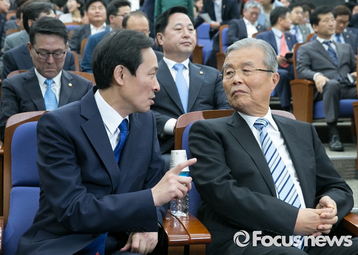 (서울=포커스뉴스) 7일 오전 서울 여의도 국회에서 열린 더불어민주당 의원총회에 참석한 김종인(오른쪽) 비대위 대표와 우상호 원내대표가 대화하고 있다.