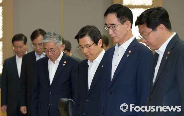 (세종=포커스뉴스) 황교안(오른쪽 세 번째) 국무총리와 국무위원들이 7일 오전 세종시 정부세종청사 국무회의장에서 열린 서울-세종 영상 국무회의에서 순국선열에 대한 묵념을 하고 있다.