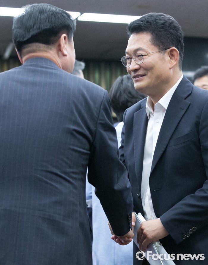 (서울=포커스뉴스) 7일 오전 서울 여의도 국회에서 열린 더불어민주당 의원총회에 참석한 송영길(오른쪽), 김두관 의원이 인사하고 있다.