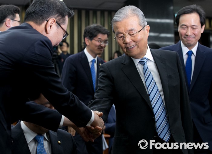 | △ 의원들과 인사하는 김종인-우상호 |