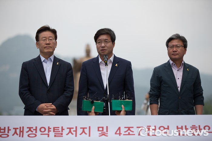 (서울=포커스뉴스) 7일 오전 서울 종로구 광화문광장에서 이재명(왼쪽부터) 성남시장, 염태영 수원시장, 채인석 화성시장이 정부의 지방재정개편안에 반대하는 단식농성 기자회견을 열고 있다.