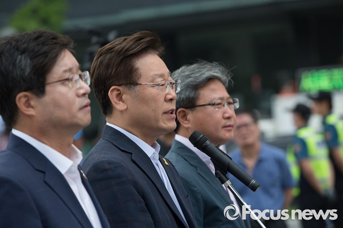 (서울=포커스뉴스) 7일 오전 서울 종로구 광화문광장에서 염태영(왼쪽부터) 수원시장, 이재명 성남시장, 채인석 화성시장이 정부의 지방재정개편안에 반대하는 단식농성 기자회견을 열고 있다.