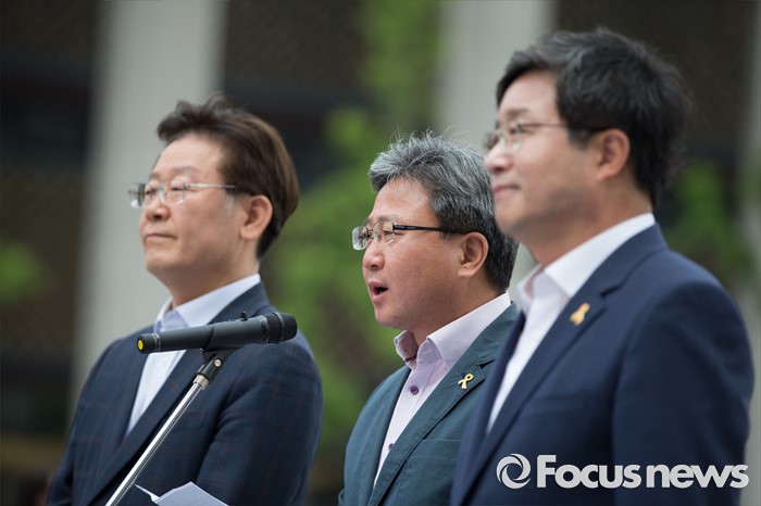 (서울=포커스뉴스) 7일 오전 서울 종로구 광화문광장에서 이재명(왼쪽부터) 성남시장, 채인석 화성시장, 염태영 수원시장이 정부의 지방재정개편안에 반대하는 단식농성 기자회견을 열고 있다.
