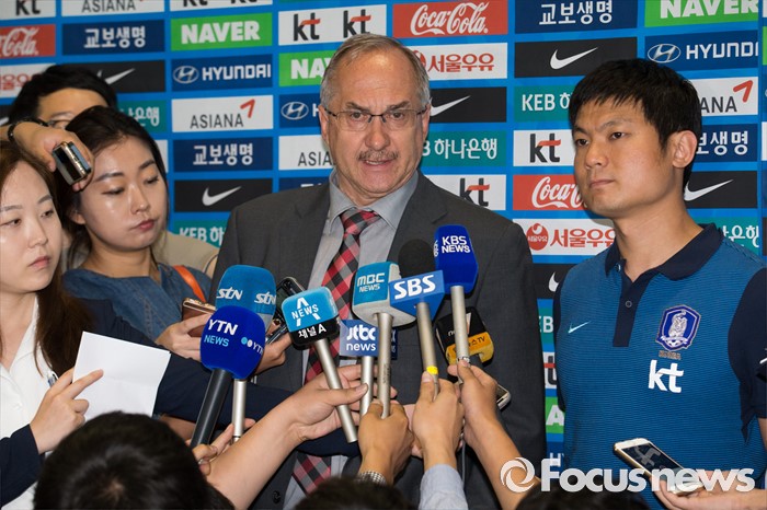 (인천공항=포커스뉴스) 유럽 원정에 나서 두 차례 평가전을 치러 1승 1패(스페인 1-6패, 체코 2-1승)를 거둔 대한민국 축구 국가대표팀 슈틸리케 감독이 7일 오후 인천국제공항을 통해 귀국 후 취재진 질문에 답하고 있다.