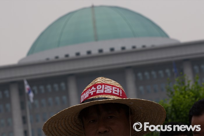 (서울=포커스뉴스) 7일 오후 서울 여의도 국회 정문 앞에서 전국농민회총연맹 회원들이 밥쌀 수입 강행하는 박근혜 정부 규탄 기자회견을 열고 있다.