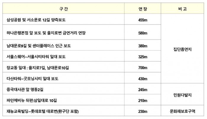 금연구역으로 지정된 지역은 집단흡연장소로 거론된 하나은행본점, 두산타워, 센터플레이스, 서울스퀘어, 장교빌딩, 삼성공원과 민원다발지역인 중국대사관 앞, 파인에뷔뉴 뒤편, 문화재보호구역인 환구단 인근으로 총 9개소 3555m에 이른다.
