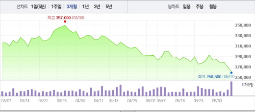 롯데케미칼은 7일 전일 대비 3.52%(9500원) 하락한 26만500원에 거래를 마쳤다. 주가는 장 초반인 9시5분 26만7000원까지 찍으며 상승세를 보였다. 그렇지만 9시30분 25만9500원으로 떨어지더니 26만원 내외를 오르내렸다.