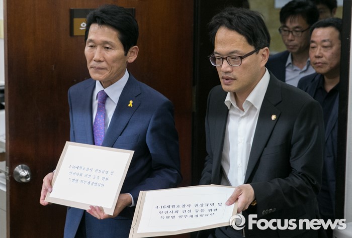 박주민 의원과 윤소하 정의당 의원은 이날 오후 국회 의안과에 세월호특별법 개정안을 제출한 뒤 정론관에서 기자회견을 갖고 개정안 발의 취지와 내용에 대해 설명했다.