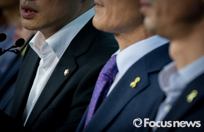 (서울=포커스뉴스) 박주민 더불어민주당 의원과 윤소하 정의당 의원, 전명선 4·16가족협의회 운영위원장, 유경근 집행위원장 등이 7일 오후 서울 여의도 국회 정론관에서 세월호 특별법 개정안 발의 기자회견을 하고 있다.