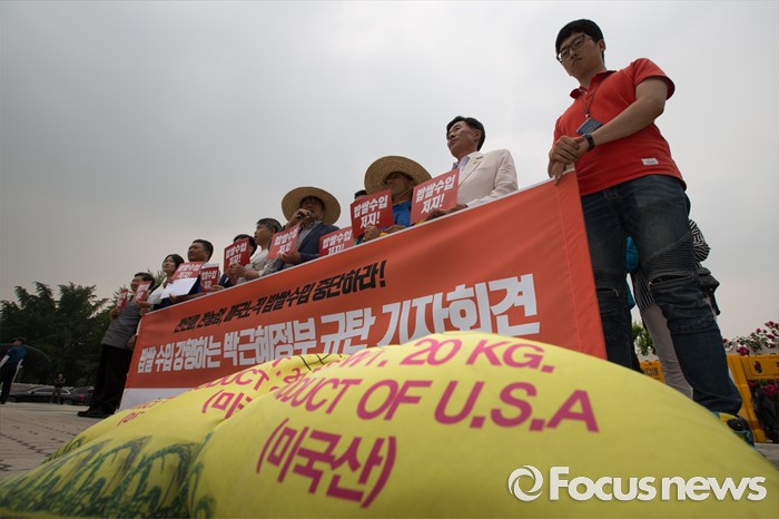 (서울=포커스뉴스) 7일 오후 서울 여의도 국회 정문 앞에서 전국농민회총연맹 회원들이 밥쌀 수입 강행하는 박근혜 정부 규탄 기자회견을 열고 있다.