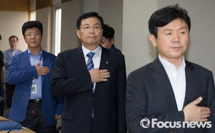 (세종=포커스뉴스) 김동원 교육부 학교정책실장이 7일 오후 세종시 정부세종청사 교육부 대회의실에서 열린 시·도 도서벽지 교원근무환경 개선대책협의에 참석 국기에 대한 경례를 하고 있다.
