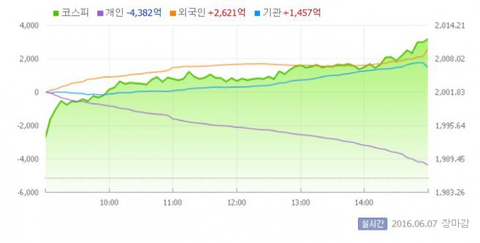 이날 코스피는 전거래일 대비 0.36% 상승한 1993.08로 장을 시작했다. 이후 지수는 외국인의 대규모 매수세에 상승세를 이어갔다.