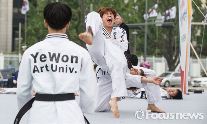 (서울=포커스뉴스) 7일 오후 서울 종로구 광화문 광장에서 열린 '2016 청주(충북) 세계무예마스터십 D-100성공기원행사'에 참여한 예원예술대학교 학생들이 시범을 보이고 있다.
