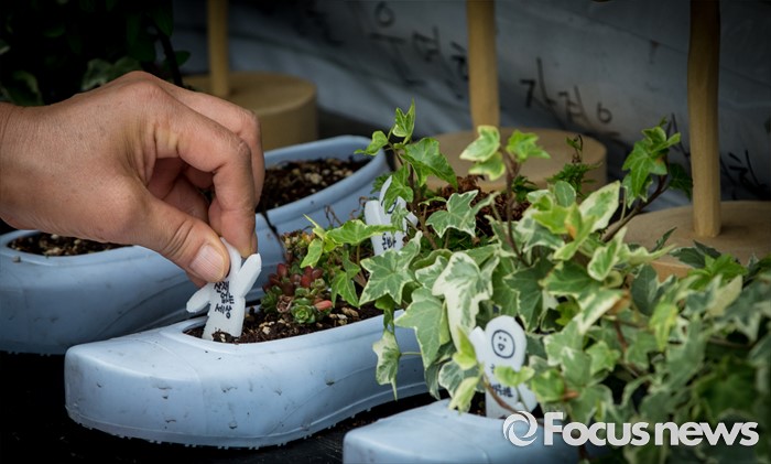 (서울=포커스뉴스) 7일 오후 서울 서초구 삼성전자 사옥 앞에서 열린 '반도체 공장 희생자들과 가습기살균제 피해자들 연대 기자회견'에서 한 참석자가 산재 없는 세상이 적힌 팻말을 화분에 꽂고 있다.