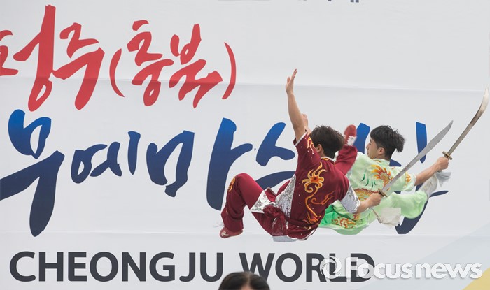 (서울=포커스뉴스) 7일 오후 서울 종로구 광화문 광장에서 열린 '2016 청주(충북) 세계무예마스터십 D-100성공기원행사'에 참여한 시범단이 우슈 동작을 선보이고 있다.