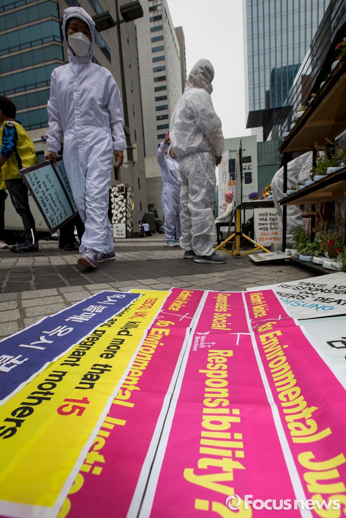 (서울=포커스뉴스) 7일 오후 서울 서초구 삼성전자 사옥 앞에서 열린 '반도체 공장 희생자들과 가습기살균제 피해자들 연대 기자회견'에서 가피모 및 반올림 회원들이 삼성 및 옥시를 규탄하는 현수막 앞을 지나가고 있다.