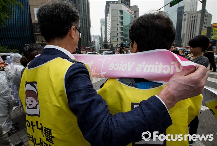 (서울=포커스뉴스) 7일 오후 서울 서초구 삼성전자 사옥 앞에서 열린 '반도체 공장 희생자들과 가습기살균제 피해자들 연대 기자회견'에서 가피모 및 반올림 회원들이 정부 및 기업의 책임을 촉구하는 구호를 외치고 있다.