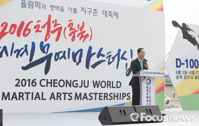 (서울=포커스뉴스) 7일 오후 서울 종로구 광화문 광장에서 열린 '2016 청주(충북) 세계무예마스터십 D-100성공기원행사'에 참여한 한덕수 조직위원장이 축사를 하고 있다.