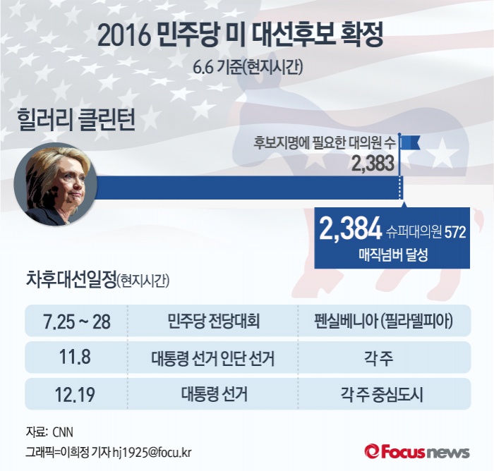 (서울=포커스뉴스) 외신은 6일(현지시간) 힐러리 클린턴 전 장관이 현재까지 대의원 2,384명(선언 대의원 1,812명, 슈퍼 대의원 572명)을 확보하며 최종 후보 지명에 필요한 매직넘버를 달성했다고 보도했다. 미국 240년 역사상 주요 정당에서 여성이 대통령 후보로 본선에 진출한 것은 처음이다.