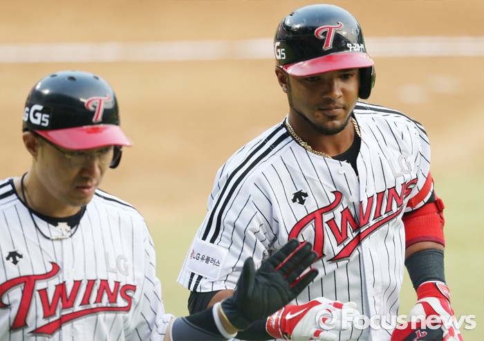 (서울=포커스뉴스) 7일 서울 잠실구장에서 열린 2016 프로야구 삼성-LG 경기 1회말 2사 1루에서 LG 히메네스가 좌월 2점 홈런을 치고 선행주자 정성훈과 함께 홈인하고 있다.