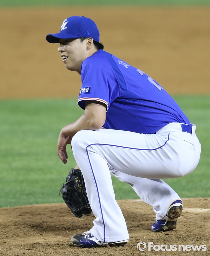 (서울=포커스뉴스) 7일 서울 잠실구장에서 열린 2016 프로야구 삼성-LG 경기 2회말 1사 2루에서 삼성 투수 차우찬이 LG 오지환을 볼넷으로 진루시키고 아쉬워하고 있다.