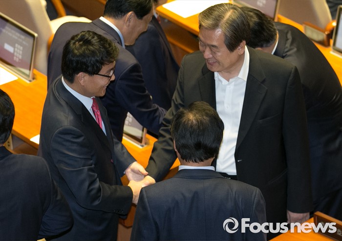 (서울=포커스뉴스) 9일 오후 서울 여의도 국회에서 열린 20대 국회 첫 본회의에 참석한 김무성(오른쪽) 새누리당 전 대표와 윤상현 무소속 의원이 인사하고 있다.