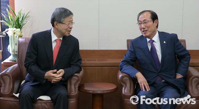 (서울=포커스뉴스) 김희옥(왼쪽) 새누리당 혁신비대위원장이 10일 오후 서울 여의도 당사를 방문한 이원종 대통령비서실장과 면담을 하고 있다.