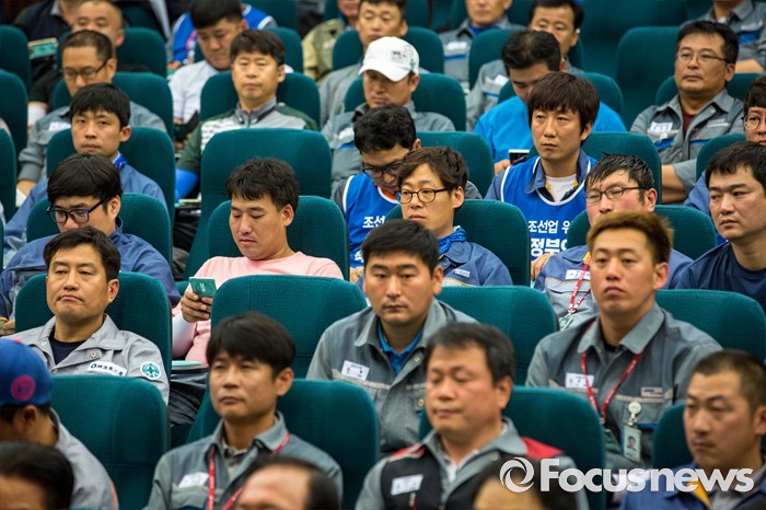 (서울=포커스뉴스) 조선산업 노동자들이 9일 오전 서울 여의도 국회도서관 강당에서 열린 '위기의 조선산업 및 노동자 구조조정 해법 모색 대토론회'에 참석 하고 있다.