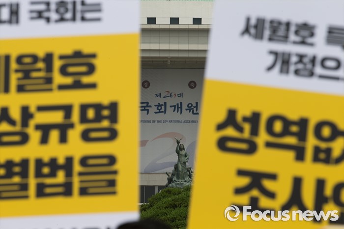 (서울=포커스뉴스) 8일 오전 서울 여의도 국회 앞에서 4.16가족협의회와 4.16연대 관계자들이 세월호 진상규명 특별법 개정 입법청원 기자회견을 하고 있다.