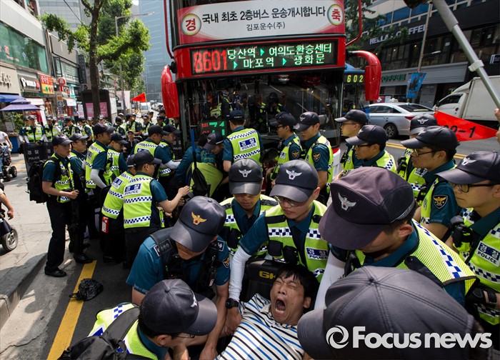 (서울=포커스뉴스) 9일 오전 서울시청 서소문별관 인근의 버스정류장에서 장애인차별철폐연대 회원들이 장애인 이동권 보장을 촉구하며 경기도행 광역버스 기습 점거시위를 벌여 경찰과 충돌하고 있다.