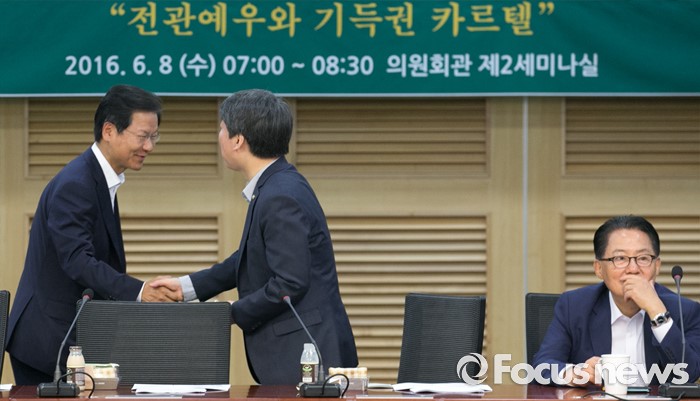 (서울=포커스뉴스) 8일 오전 서울 여의도 국회 의원회관에서 열린 국민의당 12차 정책역량강화 워크숍에 참석한 안철수(가운데) 상임공동대표와 천정배(왼쪽) 공동대표가 인사하고 있다. 오른쪽은 박지원 원내대표.