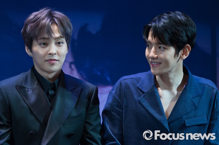 (서울=포커스뉴스) 8일 오전 서울 강남구 코엑스 아티움에서 열린 아이돌 그룹 엑소의 3집 앨범 'EX'ACT' 발표 쇼케이스에 참석한 멤버 백현(오른쪽)이 시우민을 바라보고 있다.