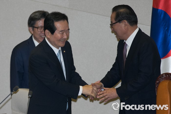(서울=포커스뉴스) 9일 오후 서울 여의도 국회에서 열린 20대 국회 첫 본회의에서 전반기 국회의장으로 선출된 정세균(왼쪽) 더불어민주당 의원이 서청원 국회의장 대행으로부터 축하를 받고 있다.