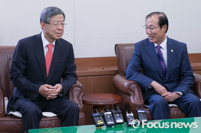 (서울=포커스뉴스) 김희옥(왼쪽) 새누리당 혁신비대위원장이 10일 오후 서울 여의도 당사를 방문한 이원종 대통령비서실장과 면담을 하고 있다.