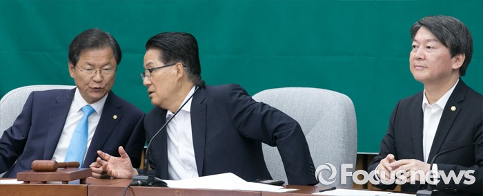 (서울=포커스뉴스) 9일 오전 서울 여의도 국회에서 국회 부의장 후보 선출을 위해 열린 국민의당 의원총회에 참석한 천정배(왼쪽) 공동대표와 박지원(가운데) 원내대표가 대화하고 있다. 오른쪽은 안철수 상임공동대표.