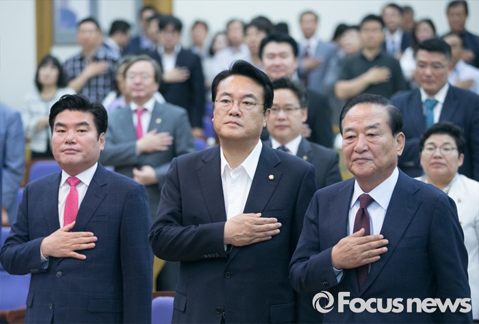 (서울=포커스뉴스) 8일 오전 서울 여의도 국회 의원회관에서 열린 국가미래전략포럼(일명 알파포럼) 창립총회 및 강연회에 참석한 정진석(가운데) 새누리당 원내대표와 서청원(오른쪽) 전 최고위원, 원유철 전 원내대표 등 참석자들이 국기에 대한 경례를 하고 있다. 이날 정 원내대표와 서 전 최고위원은 국회의장직을 야당에 양보한다는 뜻을 밝혔다.