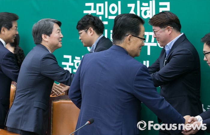 (서울=포커스뉴스) 8일 오전 서울 여의도 국회에서 열린 국민의당 최고위원회의에 참석한 천정배(왼쪽부터) 공동대표, 안철수 상임공동대표, 박지원 원내대표가 신임 당직자들과 인사하고 있다.