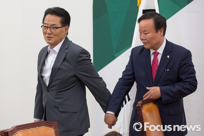 (서울=포커스뉴스) 박지원(왼쪽) 국민의당 원내대표가 10일 오후 서울 여의도 국회에서 김재원 청와대 정무수석과 면담을 마친 뒤 배웅 하고 있다.