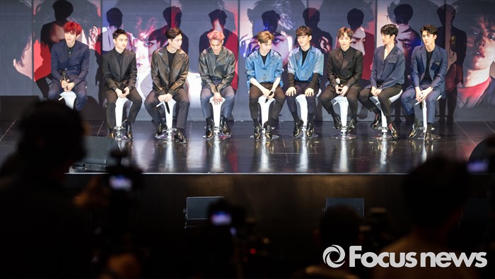(서울=포커스뉴스) 8일 오전 서울 강남구 코엑스 아티움에서 열린 아이돌 그룹 엑소의 3집 앨범 'EX'ACT' 발표 쇼케이스에 참석한 멤버들이 질의응답 시간을 갖고 있다.