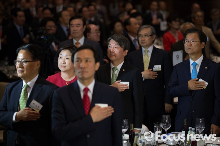 (서울=포커스뉴스) 9일 오후 서울 여의도구 63빌딩 그랜드볼룸에서 열린 '6.15 남북정상회담 16주년 기념식'에 참석한 정치인들이 국민의례를 하고 있다. 왼쪽부터 박지원 국민의당 원내대표, 심상정 정의당 대표, 우상호 더불어민주당 원내대표, 안철수, 천정배 국민의당 공동대표.