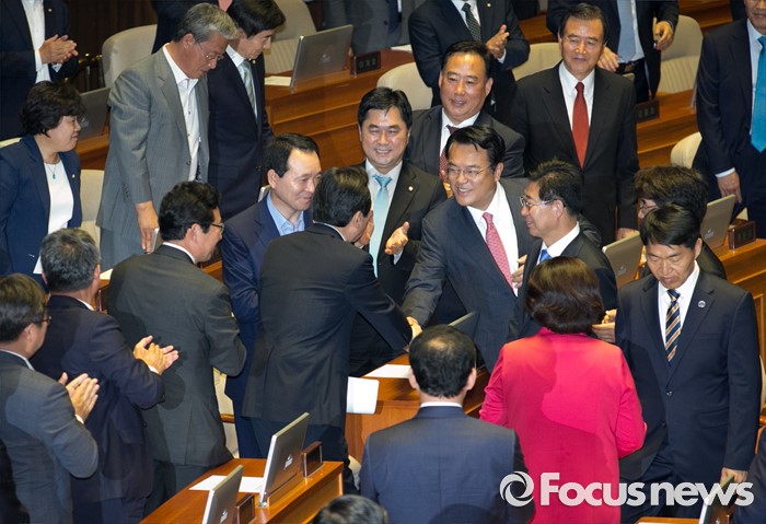 (서울=포커스뉴스) 9일 오후 서울 여의도 국회에서 열린 20대 국회 첫 본회의에서 전반기 국회의장으로 선출된 정세균 더불어민주당 의원이 단상으로 향하며 정진석 새누리당 원내대표의 축하를 받고 있다.