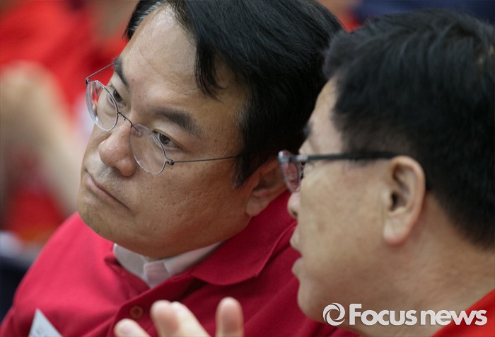 (과천=포커스뉴스) 10일 오전 경기도 과천 국가공무원인재개발원에서 열린 2016 새누리당 정책워크숍에 참석한 김광림(오른쪽) 정책위의장, 정진석 원내대표가 이기권 고용노동부 장관의 강연을 들으며 대화하고 있다.