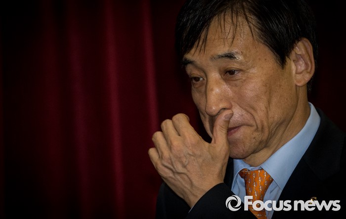 (서울=포커스뉴스) 10일 오전 서울 중구 한국은행 별관에서 열린 '한국은행 창립 66주년 기념식'에 참석한 이주열(왼쪽 세번째) 한은 총재가 생각에 잠겨 있다.