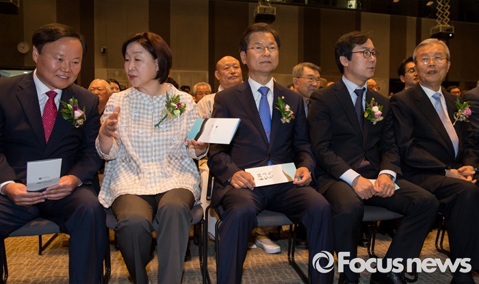 (서울=포커스뉴스) 10일 오전 서울 중구 프레스센터에서 열린 6.10 민주항쟁 제29주년 기념식에 참석한 김재원(왼쪽부터) 대통령실 정무수석, 심상정 정의당 대표, 천정배 국민의당 공동대표, 김영우 새누리당 비대위원, 김종인 더불어민주당 비대위 대표, 홍윤식 행정자치부 장관이 행사 시작을 기다리며 대화하고 있다.